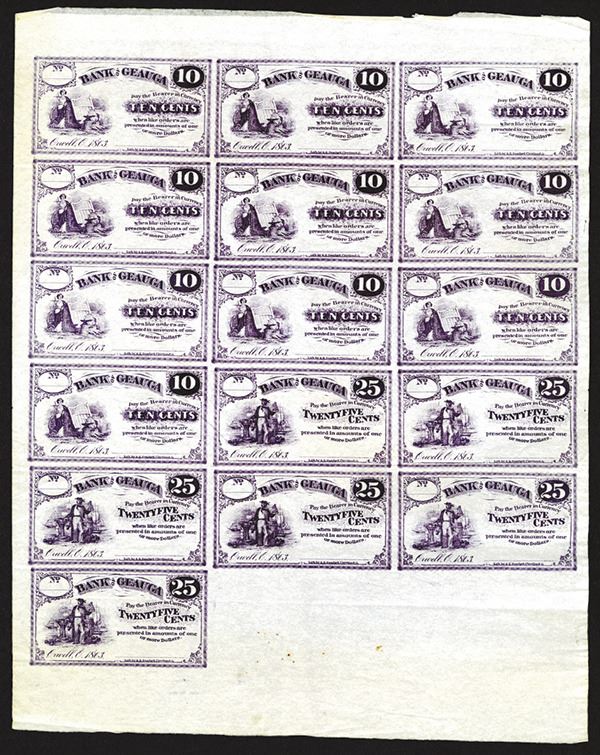 Ohio. 10, 25 cents. Uncut sheet remainder. Unnumbered, unsigned. Sheet includes 10 examples of the 10 Cents notes and 6 examples of 25 cents notes. Female standing with shield on first, sailor at capstan on latter. Imprint of A.S. Sanford, Cleveland. Lightest spotting in non-image area near bottom. Old horizontal bends as if rolled and flattened long ago. Otherwise as made.