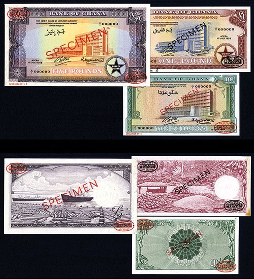 Ghana, 1st July 1958, Lot of 3 notes, Includes 10 Shilling, P-1s, Specimen No.3 on lower left; 1 Pound, P-2s, Specimen No.2 on lower left and 5 Pounds, P-3s1, with Specimen No.17 on lower left border, all have evidence of previous mounting on the right side back margins, the 10/- and 1 Pound would grade Uncirculated, the 5 Pounds Choice AU. All with oval TDLR Specimens overprints on lower right and upper left, TDLR.