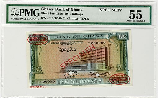 Ghana. Specimen 10 Shillings, 1958, P-1as. PMG graded About Unc 55 with comment "Previously Mounted" (Cert # 5003617-008).
