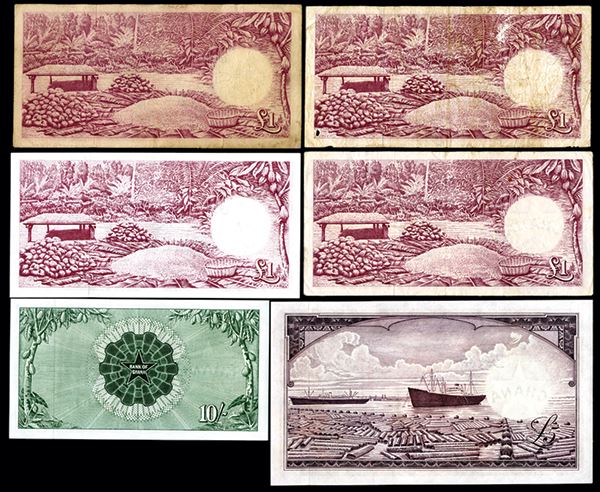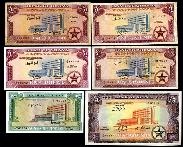 Ghana, Lot of 6 notes, Includes £1 (4), 1958, 1958, 1962 issues, VG to CU; 1963, 10/- Shillings, P-1d, Choice AU; £5, P-3d, Choice AU to Unc. Attractive assortment.