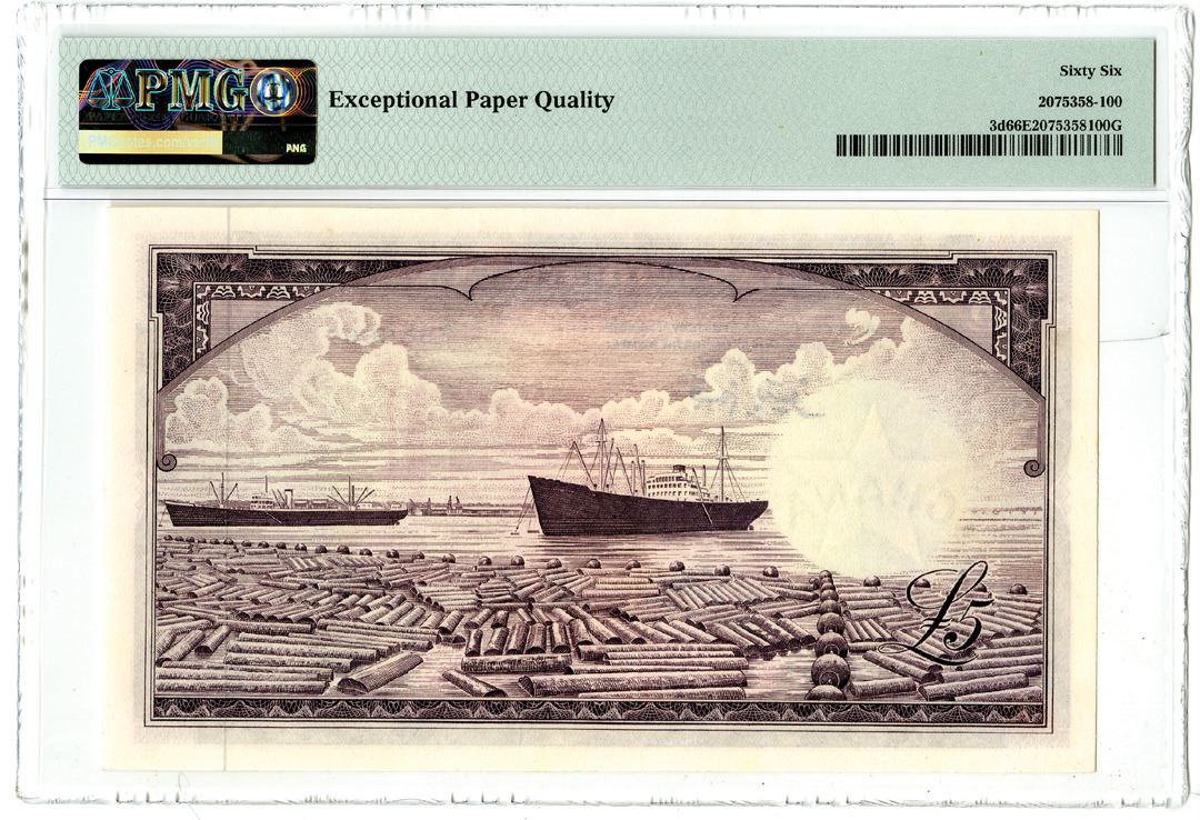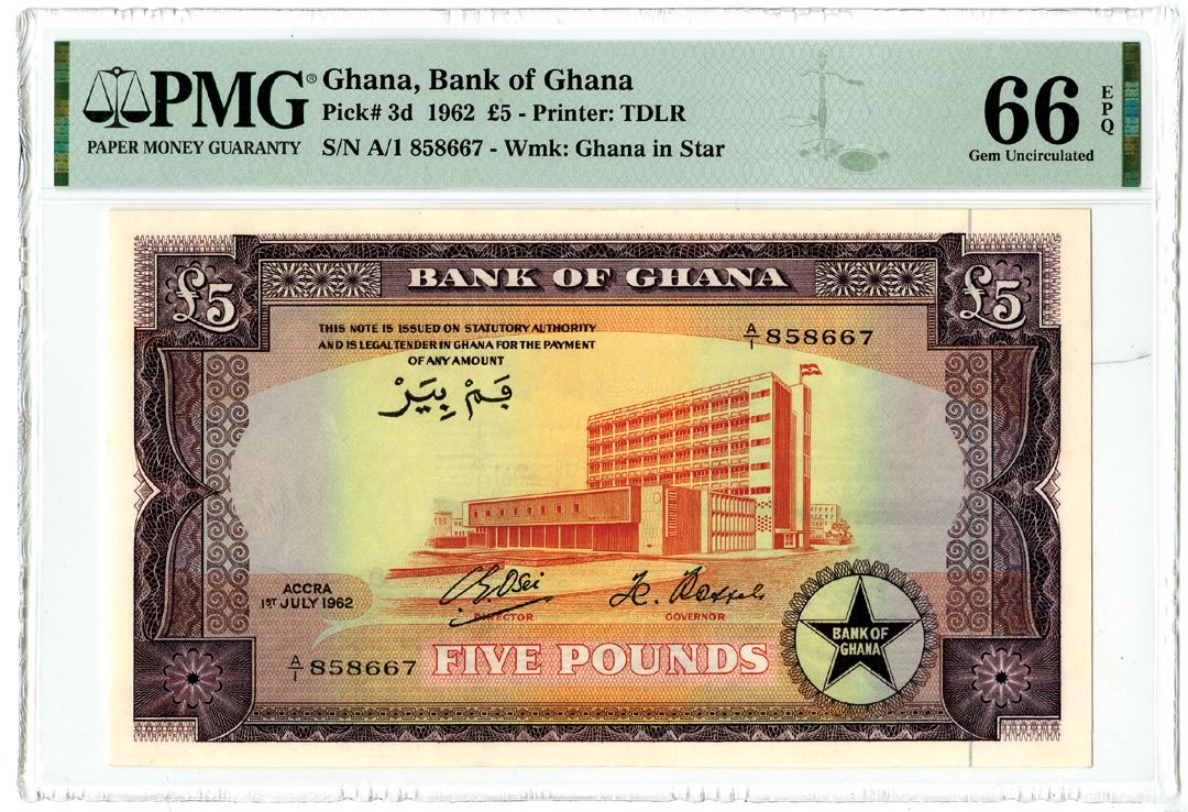 Ghana....., 1962. 5 Pounds, P-3d, Issued Banknote. Purple and orange on m/c underprint. Bank of Ghana building in Accra at center. S/N A/1 858667 with watermark of the word "Ghana" in a star shape. Printer: TDLR. PMG graded Gem Uncirculated 66 EPQ. (From the Allen Berk Collection)