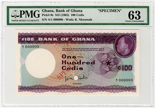 Ghana. Specimen 100 Cedis, ND (1965), P-9s. PMG graded Choice Unc 63 (Cert # 5003615-001).
