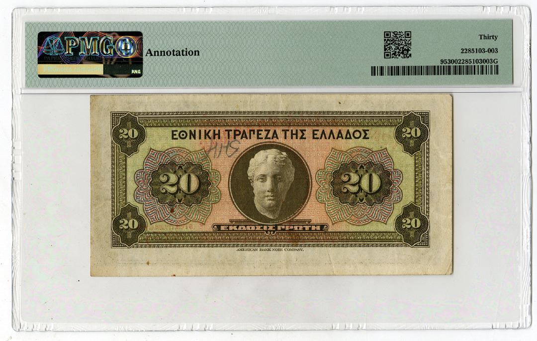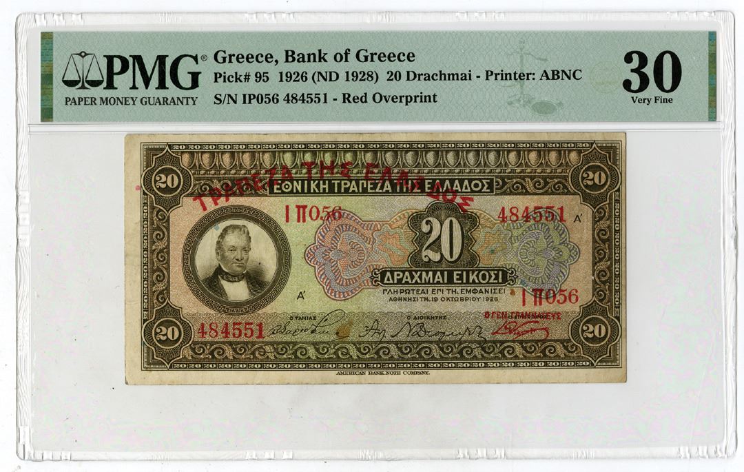 Greece. 1926 (ND 1928), 20 Drachmai, P-95a, Issued banknote, Brown on m/c with red overprint, G. Stavros at left, Red new bank name in curved line across paper center, S/N IP056 484551, PMG graded Very Fine 30, ABNC.