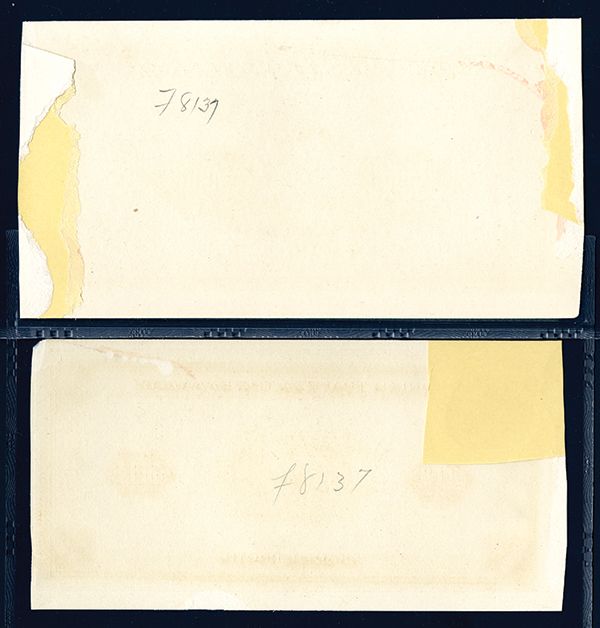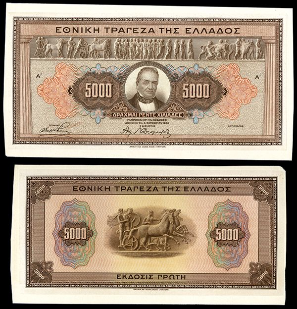 Bank of Greece, 1926 Printer's Essay Proof. Greece, 1926, 5000 Drachmai, P-101pe, Uniface front and back proofs printed on india paper on cut down thin card, Stavros at center on face with frieze on top, back brown, the issued note only appeared with the red name change on the face, this was the base note without the overprint that was never issued this way, Both are PMG graded Choice Uncirculated 63, Rare note without overprint. This is the only note listed in the PMG census. ABNC.