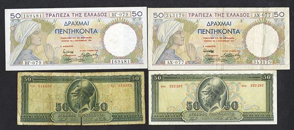 Greece. 50 Drachmai. P-104A (2) Nice Very Fine or better; 191a (2, one nearly vertically split). 4 pieces.
