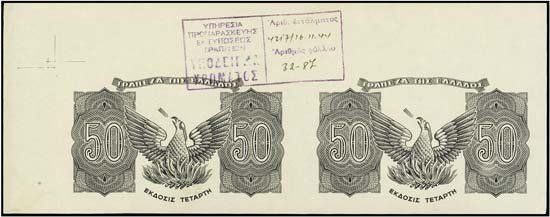 P-169 Unlisted Proofs. 50 Drachmai. 4 different progressive back proof pairs. 4 different uncut horizontal pairs with large top margins and archival hand stamp with dates 16-11-44. Includes one uncut uniface back proof pair of title, vignette and text without undertint; 3 different progressive uniface back proof pairs of various All are extremely rare and are from a new find. Choice to gem uncirculated. Printed in locally in Greece during the war.