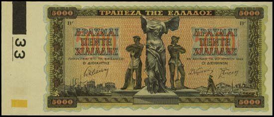 P-119 Unlisted Proofs. 5000 Drachmai. 5 different progressive proofs of the faces and backs. Group includes one fully printed proof with a complete face and back; one face proof of title, vignette and text without undertint printed in black; 2 additional different uniface progress face proofs; one different progressive uniface back proof in lig All are extremely rare and are from a new find. Uncirculated to gem uncirculated. Printed locally in Greece during the war. 2 complete sets found in archive.