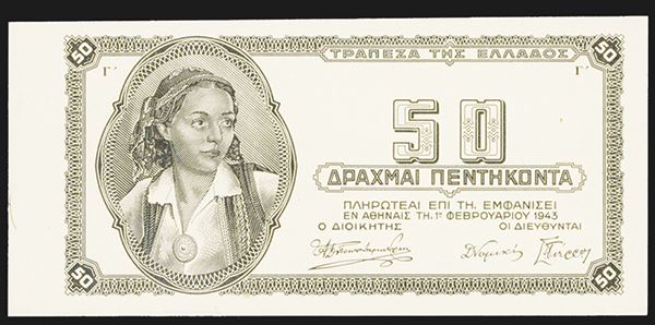 Greece, 1943, 50 Drachmai. P-121 Unlisted Proof. Partially printed proof banknote with partially printed face with title, text and vignette in black and no undertint and back with light beige undertint that should have been used on face. Choice to gem uncirculated. Printed locally in Greece during the war.
