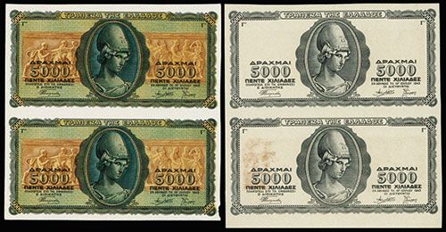 Greece,1943. Lot of 2 different progress face proof pairs (4 notes). 5000 Drachmai, P-122 Unlisted, Includes Full color uniface front proof and Black and white uniface front proof. Uncirculated to CU condition.