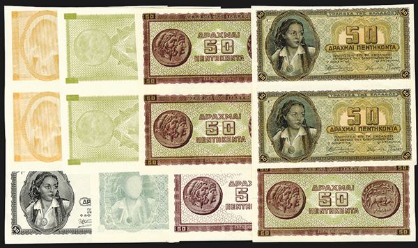 Greece, P-121 Unlisted Proof. 50 Drachmai. 8 different Uncut progressive proof pairs (16 Notes). Group includes one fully printed uncut specimen or proof banknote pair and additional progress proofs at various stages, AU to Choice uncirculated. Printed locally in Greece during the war.