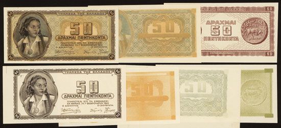 Greece, 1943, 50 Drachmai, P-121 Unlisted Proofs. 7 different progressive proofs of the faces and backs. Group includes one fully printed proof banknote with a complete face and back and various combinations of progressive proofs. All are extremely rare and are from a new find. Uncirculated to Gem Uncirculated. Printed locally in Greece during the war.