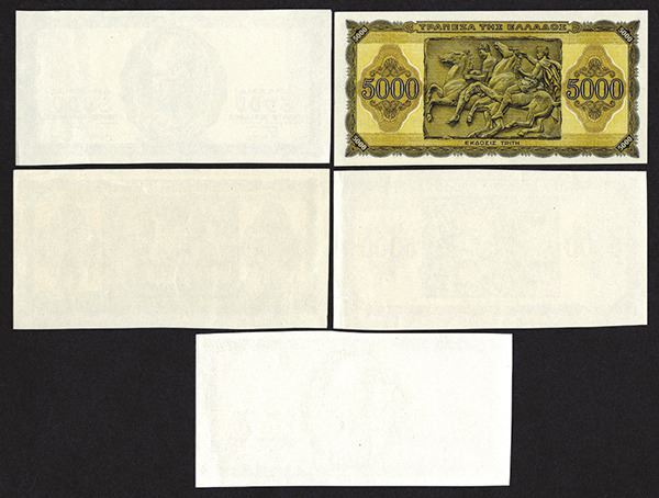 Greece. 5000 Drachmai. P-122 for type. Face and back black color uniface prints, Full color face and back (slight edge tear at top), each uniface; Two sided complete note but for serial #. Uncirculated except where noted. 5 pieces.