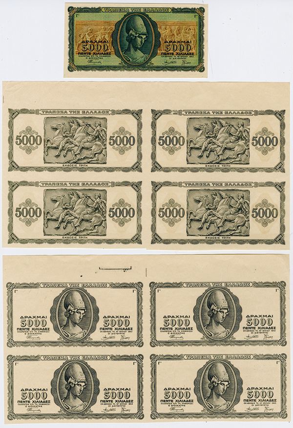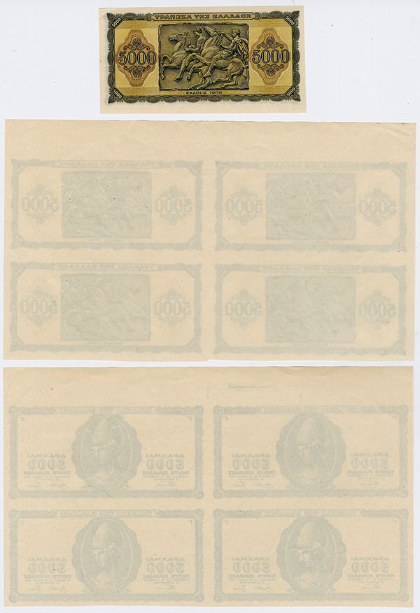 Greece, Lot includes 9 notes, 2 uncut sheets of 4 of the face and back without color undertint and a single specimen without serial number but full color, 5000 Drachmai, P-122 unlisted progress proof of the face and back printed in black without undertints, also included is an Unmarked Specimen with no serial numbers, Athena on face, back with relief, Uncirculated to CU condition. Rare in this format.