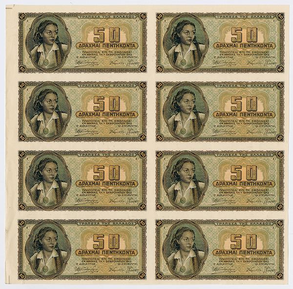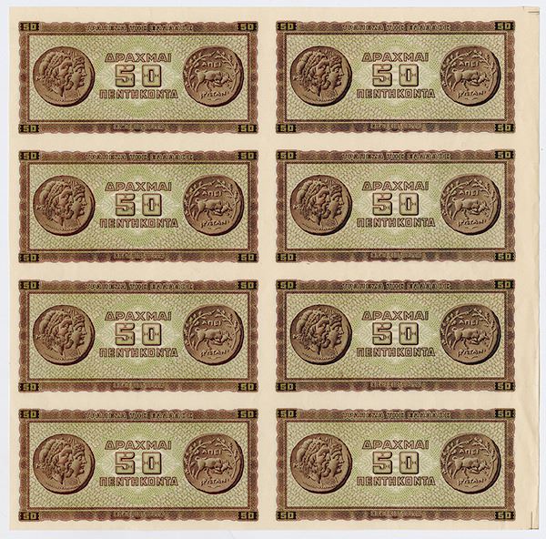 Greece, Uncut Specimen sheet of 8 notes, 50 Drachmai, P-121 Unmarked Specimen, No serial numbers, Woman from paramithia at left, Ancient coin on back, Uncirculated to CU condition. Rare in this format.