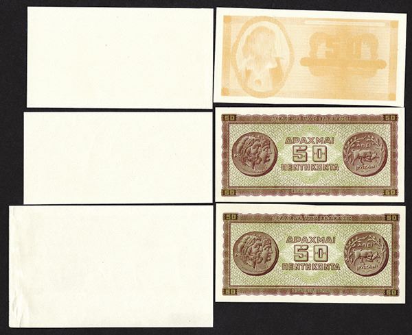 Greece. 50 Drachmai. P-121 for type, unlisted in this form. One complete note and each color of face uniface (one underprint color even printed on the other side); Back with underprint and main color, with two face underprints on one. Wide margin on one which is Very Fine + . Uncirculated except where noted. 6 pieces.