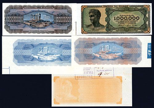 Greece, 1944, 1,000,000 Drachmai, P-127 Unlisted Proofs. 5 different progressive face and back proofs of undertints in various colors. All are extremely rare and are from a new find. Uncirculated to gem uncirculated. Printed locally in Greece during the war.