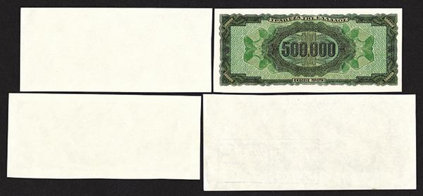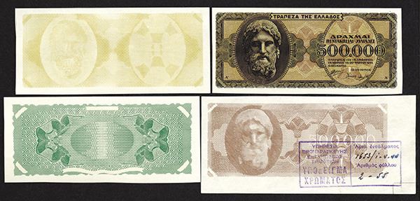 Greece. 500,000 Drachmai. P-126 for type. One completed note but for serial #; two face underprint colors, individually, one with printing production stamp; one back underprint, with wide margin. All but the first is uniface. Uncirculated. 4 pieces.