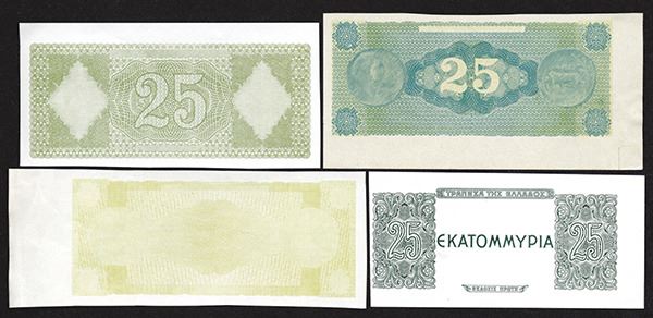 Greece. 25,000,000 Drachmai. P-130 for type. Face underprint and second underprint color combined, both uniface. Main color and underprint of back, both uniface. Wide margin on one. Extremely Fine to Uncirculated. 4 pieces.