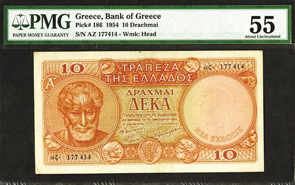 Greece. 10 Drachmai. P-186. Aristotle at left, ancient coins in border motif. PMG graded About Uncirculated 55.
