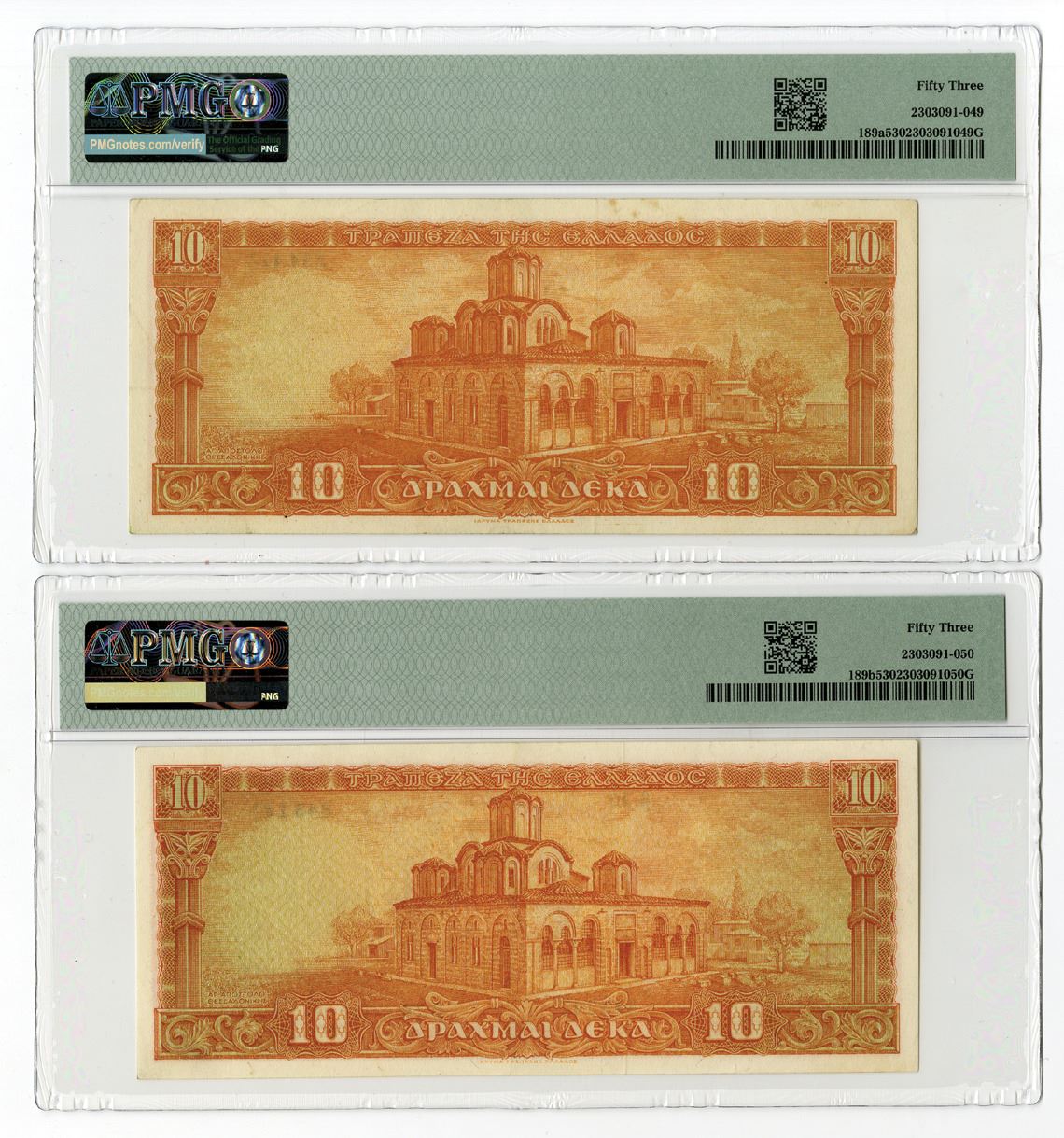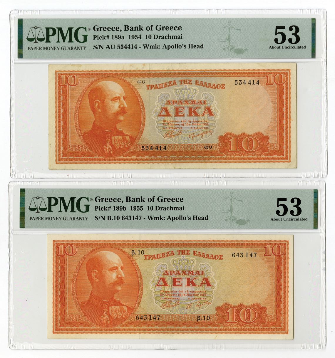 Greece, 1954. 10 Drachmai (2), P-189a & P-189b, Pair of Issued Banknotes, Orange on blue and m/c underprint with King George I at left, Back is orange on green with church at center, S/Ns AU 534414 & B.10 643147, Both are PMG graded About Uncirculated 53. (2). Sold "AS IS" no returns accepted.