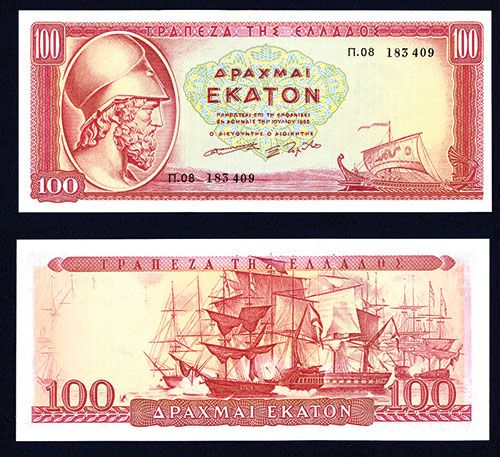Greece,1955, 100 Drachmai, P-192b, Issued banknote, red on m/c, Themistocles at left, back red, Choice to Gem Uncirculated condition. Attractive note and superior grade for the issue.