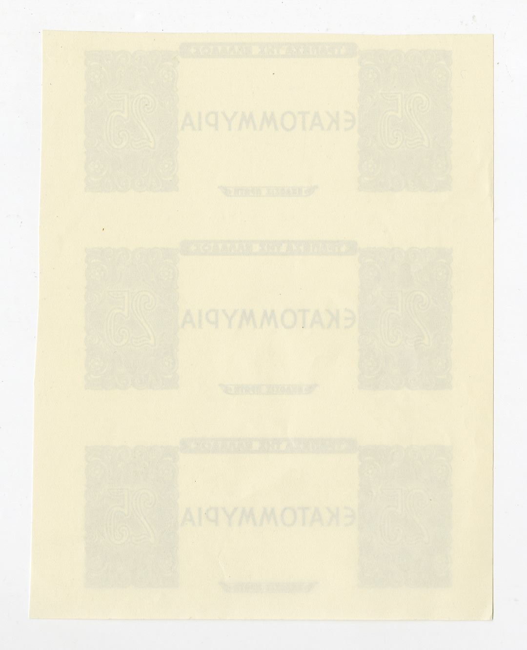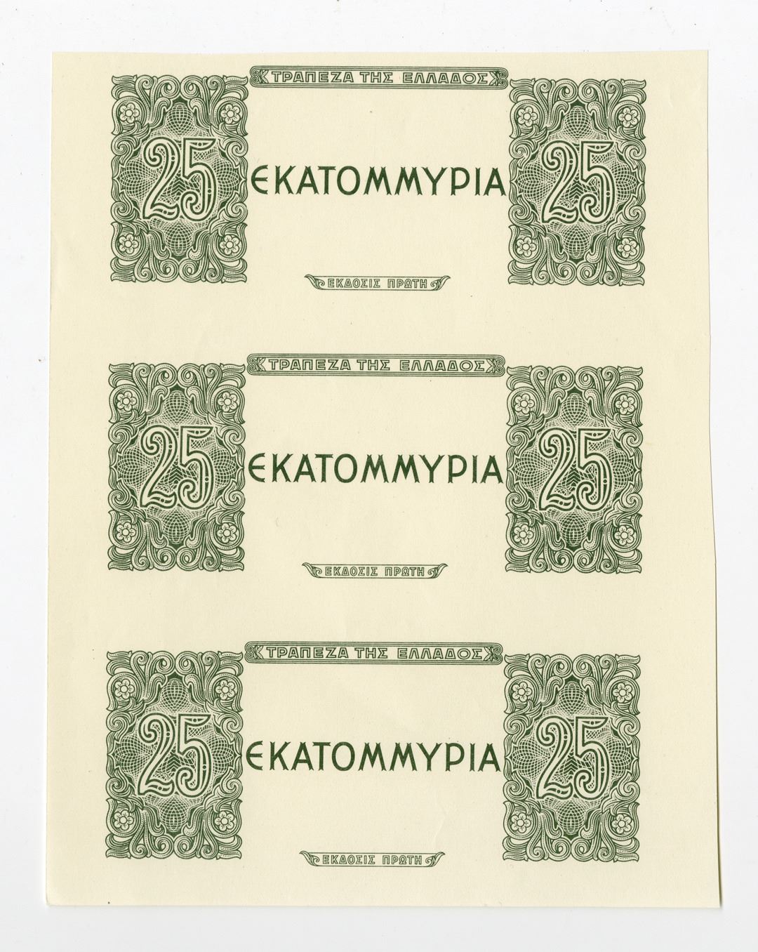 Greece. 1944 Inflation Issue, 25,000,000 Drachmai, P-130 Unlisted progress proof back, uncut sheet of 3 notes, no underprint, Uncirculated. Greek local printer.