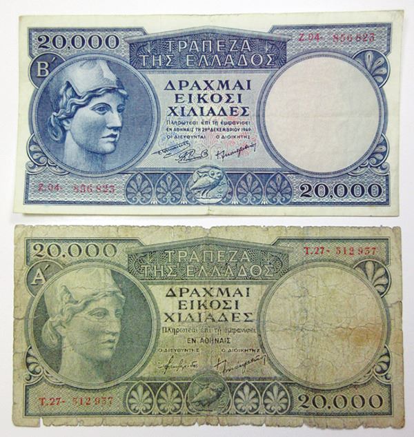 Greece... lot of 2 notes, includes P-176 Very Good and P-P-183 VF.