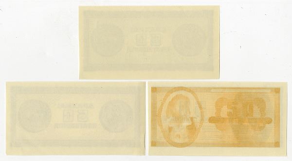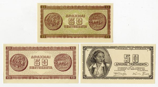 Greece. Lot of 3 notes, all are progress proofs or Trial Color Progress proofs of 50 Drachmai, P-121, Includes Black printing without underprint of face with portrait of woman from Paramithia at left with undertint missing but printed on the back in light brown; and 2 different progress proofs of the reverse, both with blank backs. All are in AU to CU condition. Scarce in this format.