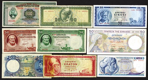 Greece. 20, 50, 100 Drachmai. P-98a; 104a; 107a; 168a; 170a; 190a; 191a; 192b (stains); 195a. Many classic Greek sculptures. Mostly Very Fine to Extremely Fine. 9 pieces.