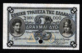 1885. 2 Drachmai. P-35 Unlisted Specimen banknote. Black on light blue and yellow undertint, back blue (issued colors). Hermes on left and Athena on right with large numeral "2" in the middle. "000" serial numbers and one POC on face and back also with "00,000" serial numbers. Top and bottom edges appears rough, but they are rouletted to allow easy separation of notes, the sides are imperforate. AU condition with very slightly wavy paper and not folds. BWC. Rare specimen from early scarce Greek issue. Attractive little note.