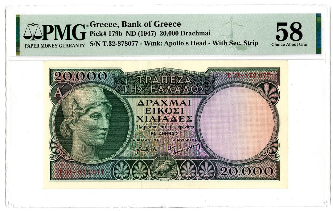 Greece. ND (1947). 20,000 Drachmai, P-179b, Issued Banknote. Green and m/c underprint with bust of Apollo at left. S/N T.32-878077 with watermark of Apollo's head. PMG graded Choice About Uncirculated 58.