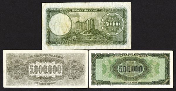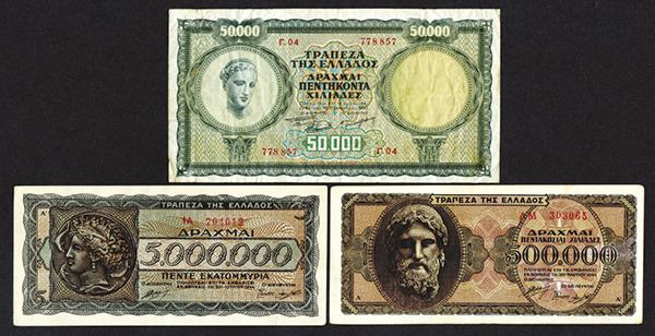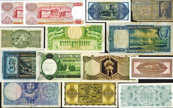 Greece. P-109; 110a; 111a; 122a; 126a; 128a; 133b; 171a; 172a; 183; 185; 196b (2); 324b; 325; 326. Some wonderful classical Greek themes. Pus WWII Italian Occupation. 50 Drachmai. P-M3. Generally Very Fine to Uncirculated. The last has paper loss at right end. 17 pieces.