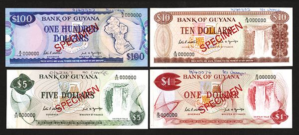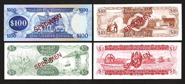 Guyana. 1, 5, 20, 100 Dollars. P-21fs; 22es; 23ds; 28as. Varieties unlisted as Specimen. First two with tape residue at left end; all with ink numerals and "No Change" notation in top margin. All with 000000 serial #s and red SPECIMEN overprint on both sides. Choice About Uncirculated or better. 4 pieces.