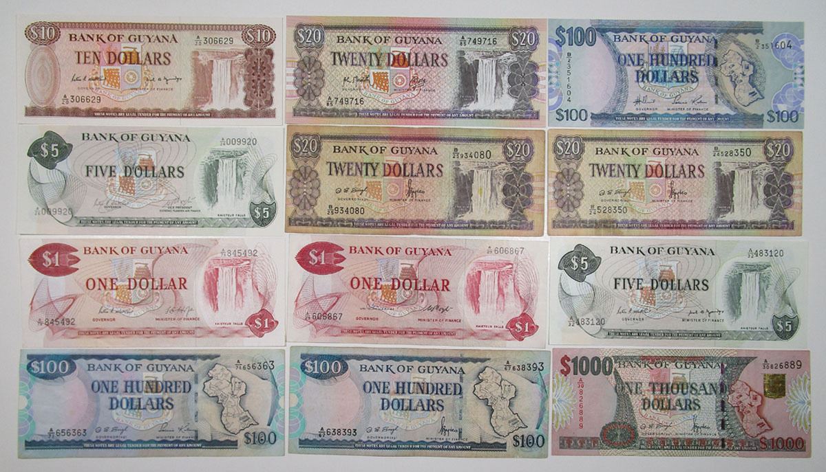 Guyana. Lot includes a dozen of 1, 5, 10, 20, 100, and 1000 Dollar notes. P-21 (2); 22 (2); 23; 27; 30; 31 (2); 35 (2); 36. Fine to Unc.