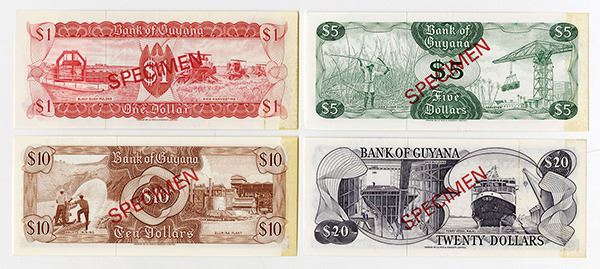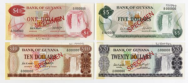 Guyana. Four printer's internal specimens. Includes 20 Dollars, P-24bs; 10 Dollars, P-23bs; 5 Dollars, P-22cs; and 1 Dollar, P-21ds. Red SPECIMEN overprints, pen annotations in top margin ($5-$10-$20) / top margin ($1) with order number. All notes bear Signature 5 and have zero serial numbers. Previously mounted from the left margin, otherwise About to Choice Unc. TDLR.