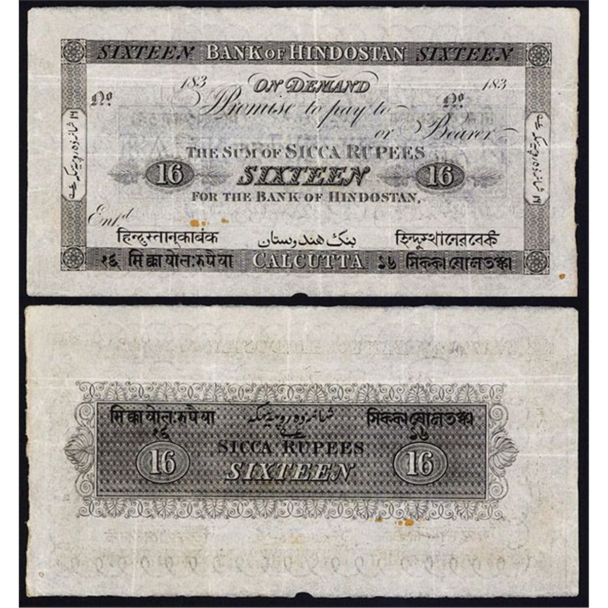 Calcutta, India, 183x (ca.1830), 16 Rupees (= 1 Gold Mohur), P-S137, Bank of Hindustan, an unissued note, black with ornate border and no vignette, No Serial Numbers, The note has fresh crisp paper and has apparently survived to the present due to being folded and kept as a souvenir. This note is fully printed on banknote paper and may only exist in 4 or 5 examples worldwide. Extremely rare and desirable. The only available issued notes on banks in India are those from the Bank of Bengal cut cancelled hoard and the occasional Bank of Bombay 10 Rupee. Recently an Indian Calcutta Bank black & white proof front 5 Rupee printed on card brought US$29,000 (in 2010 at a Lyn Knight sale). We estimate this piece conservatively in the range of $15,000-20,000.