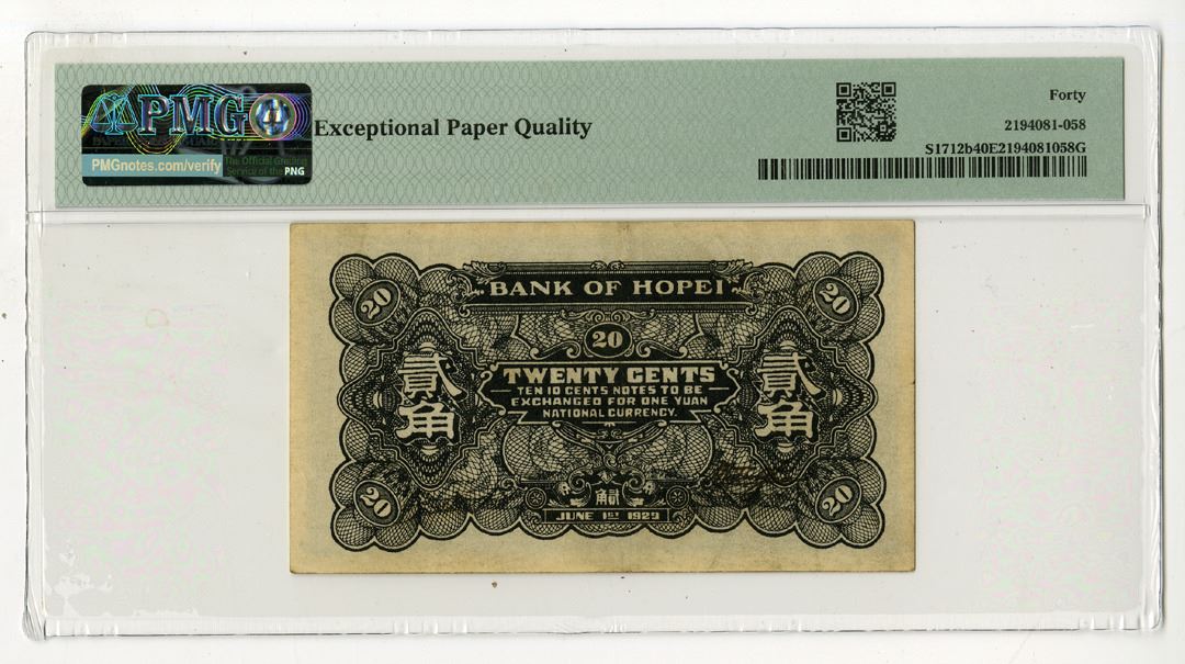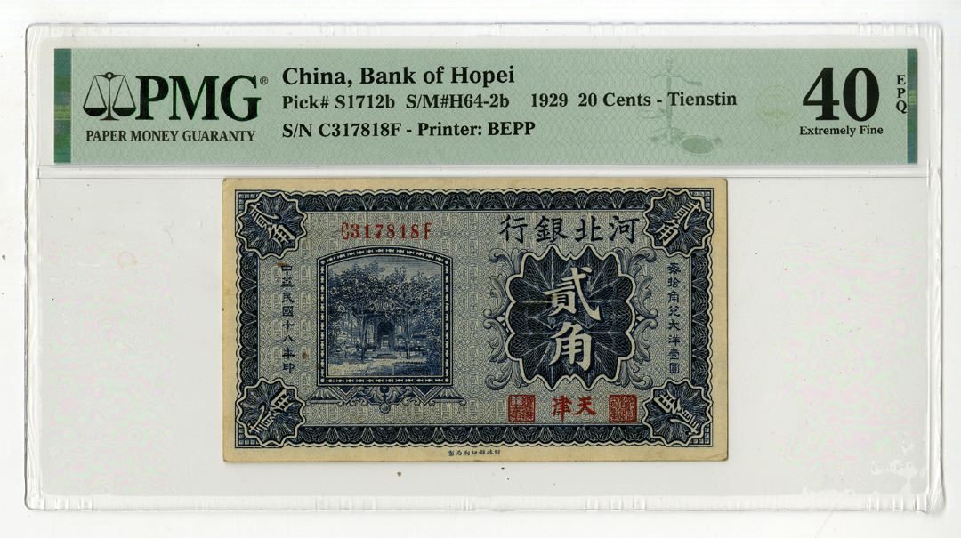 China, 1929. 20 Cents, P-S1712b S/M#H64-2b, Issued Banknote, Dark blue on light blue underprint with hut at left, Back is black, S/N C317818F, PMG graded Extremely Fine 40 EPQ, BEPP.