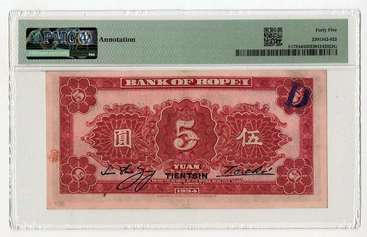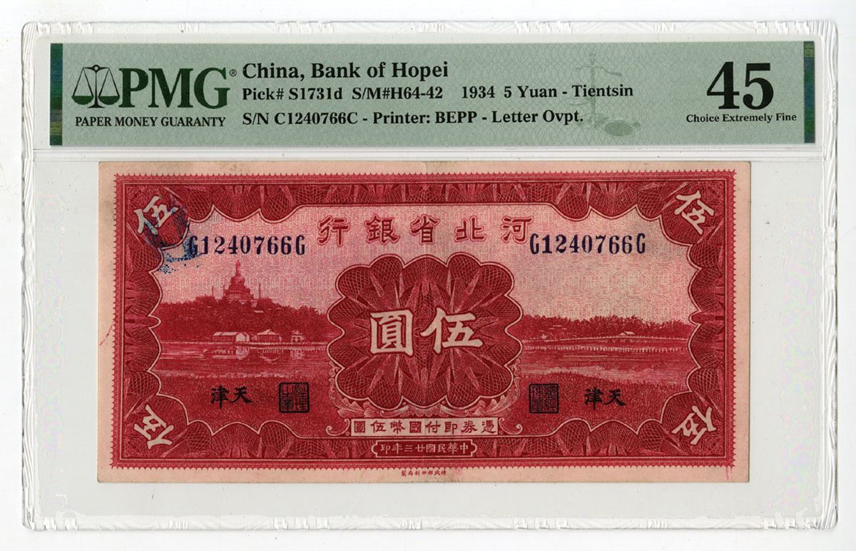 Tientsin, China, 1934. 5 Yuan, P-S1731d S/M#H64-42, Issued Banknote, Red Printing with Summer Palace above shoreline at left and right, Back is red, S/N C1240766C, PMG graded Choice Extremely Fine 45 with comment "Annotation", With Letter Overprint "D", BEPP. This is the highest graded example out of 5 notes graded in the PMG census. No previous auction appearances are listed in the Greysheet Census.