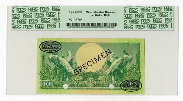 Indonesia. 1959, 10 Rupiah, P-66s , Specimen Banknote, Specimen and Oval TDLR overprints on top left and lower right corners, Minor Mounting remnants on back right margin that is difficult to view. PCGS graded Very Choice New 64, POC, TDLR.
