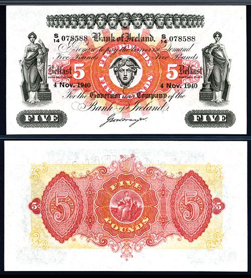 Belfast, Northern Ireland, 4 Nov., 1940, 5 Pounds, P-52b BA98, Issued banknote, S/N S/14 078588, Frazer signature, PMG graded Choice About Uncirculated 58, the note appears Choice Uncirculated, conservatively graded and a premium example for the grade. The second of only two graded by PMG, this being the highest grade.