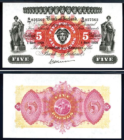 Belfast, Northern Ireland, 1 Sep., 1958, 5 Pounds, P-52b BA100, Issued banknote, S/N S/24 057562, Skuce signature, PMG graded About Uncirculated 55, conservatively graded and a premium example for the grade. The second of only two graded by PMG.