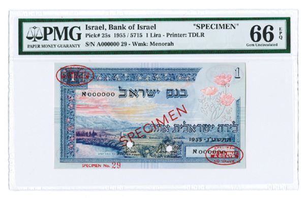 Israel, 1 Lira, P-25s, Specimen, Blue on m/c and light green paper, S/N A000000 30, Red specimen overprints and red oval TDLR Specimen overprints on the top left and lower right of face and back, PMG graded Superb Gem Uncirculated 67 EPQ. Scarce in this high of grade. TDLR. This is the second highest graded offered at auction in over 14 years.