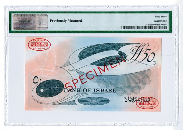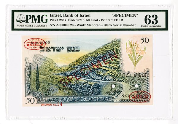 Israel, 50 Lirot, P-28as, Specimen, Dark blue on m/c, S/N A000000 24, Red specimen overprints and red oval TDLR Specimen overprints on the top left and lower right of face and back, PMG graded Choice Uncirculated 63. TDLR.