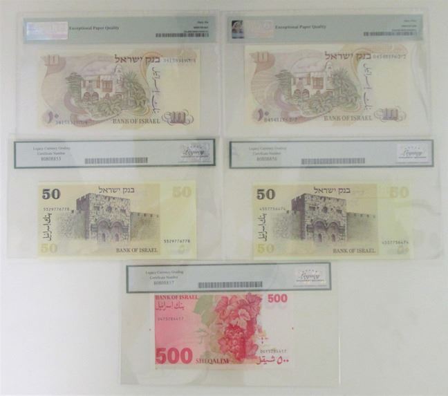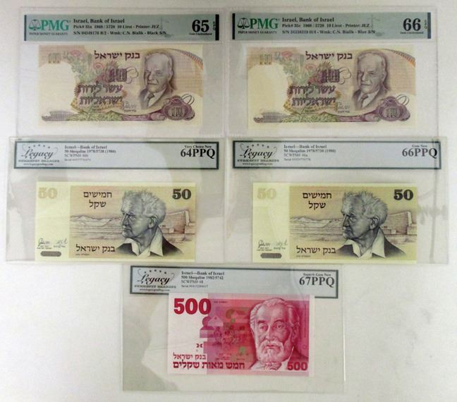 Israel, 1968-82. Lot of 5 Issued Banknotes, Includes: 10 Lirot, P-35a, 1968, PMG graded Gem Unc 65 EPQ, JEZ; 10 Lirot, P-35c, 1968, PMG graded Gem Unc 66 EPQ, JEZ; 50 Sheqalim, P-46a, 1978 (1980), LCG graded Gem New 66 PPQ; 50 Sheqalim, P-46b, 1978 (1980), LCG graded Very Choice New 64 PPQ; 500 Sheqalim, P-48, 1982, LCG graded Sup Gem New 67 PPQ. (5). Sold "AS IS" no returns accepted.