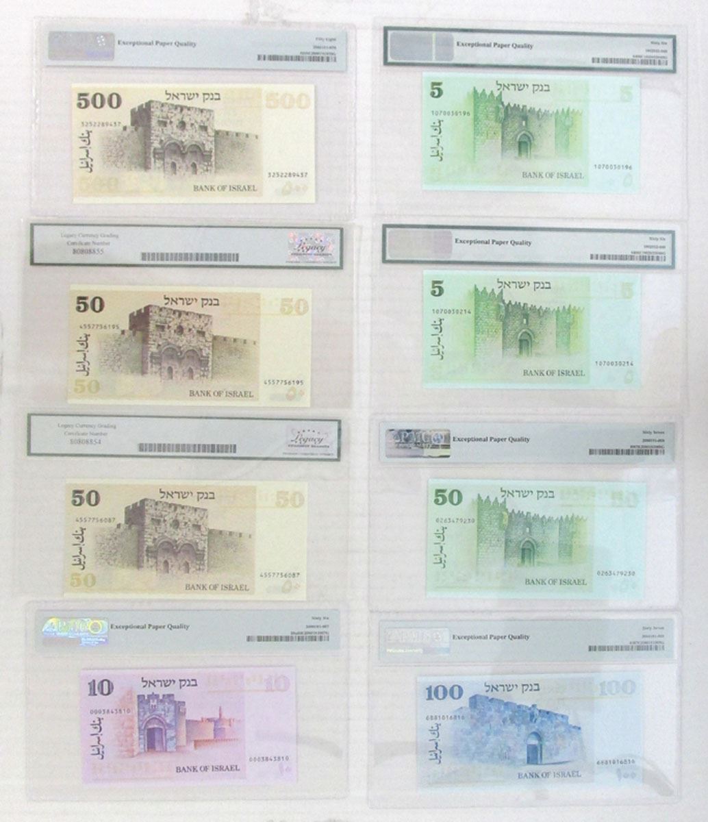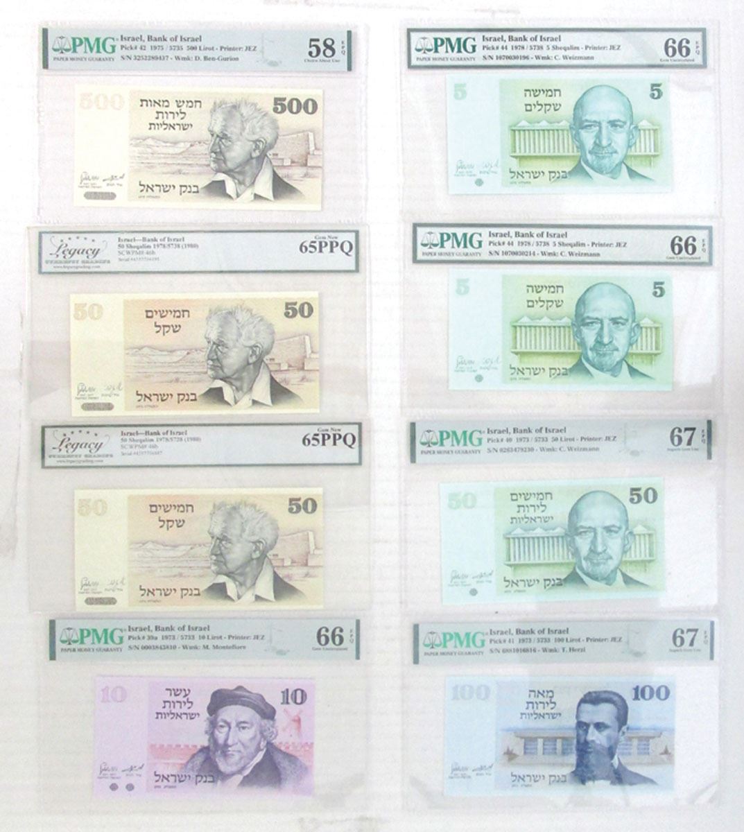 Israel, 1973-78. Lot of 8 Issued Banknotes, Includes: 10 Lirot, P-39a, S/N 0003843810, PMG graded Gem Unc 66 EPQ; 50 Lirot, P-40, S/N 0263479230, PMG graded Superb Gem Unc 67 EPQ; 100 Lirot, P-41, S/N 6881016816, PMG graded Superb Gem Unc 67 EPQ; 500 Lirot, P-42, S/N 3252289437, PMG graded Choice About Unc 58 EPQ; 5 Sheqalim, P-44 (2), S/Ns 1070030196 & 1070030214, Both are PMG graded Gem Unc 66 EPQ; 50 Sheqalim, P-46b (2), S/Ns 4557756087 & 4557756195, Both notes are LCG graded Gem New 65PPQ. All notes were printed by JEZ. (8). Sold "AS IS" no returns accepted.