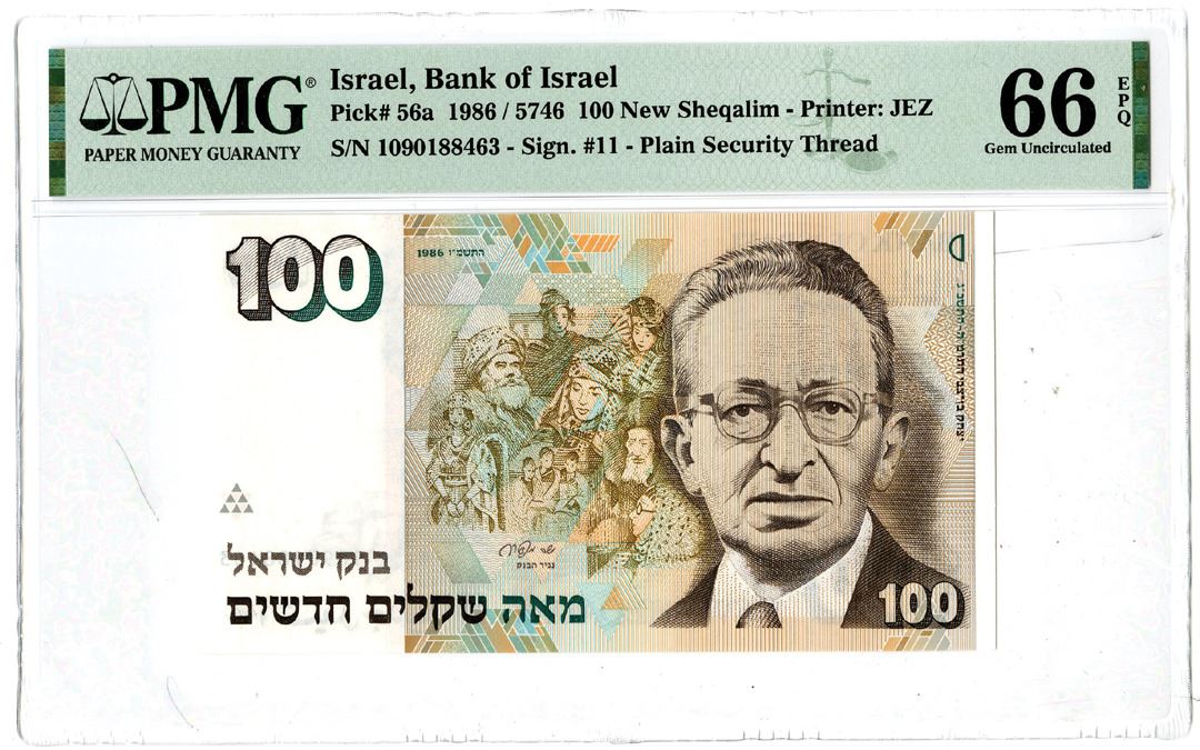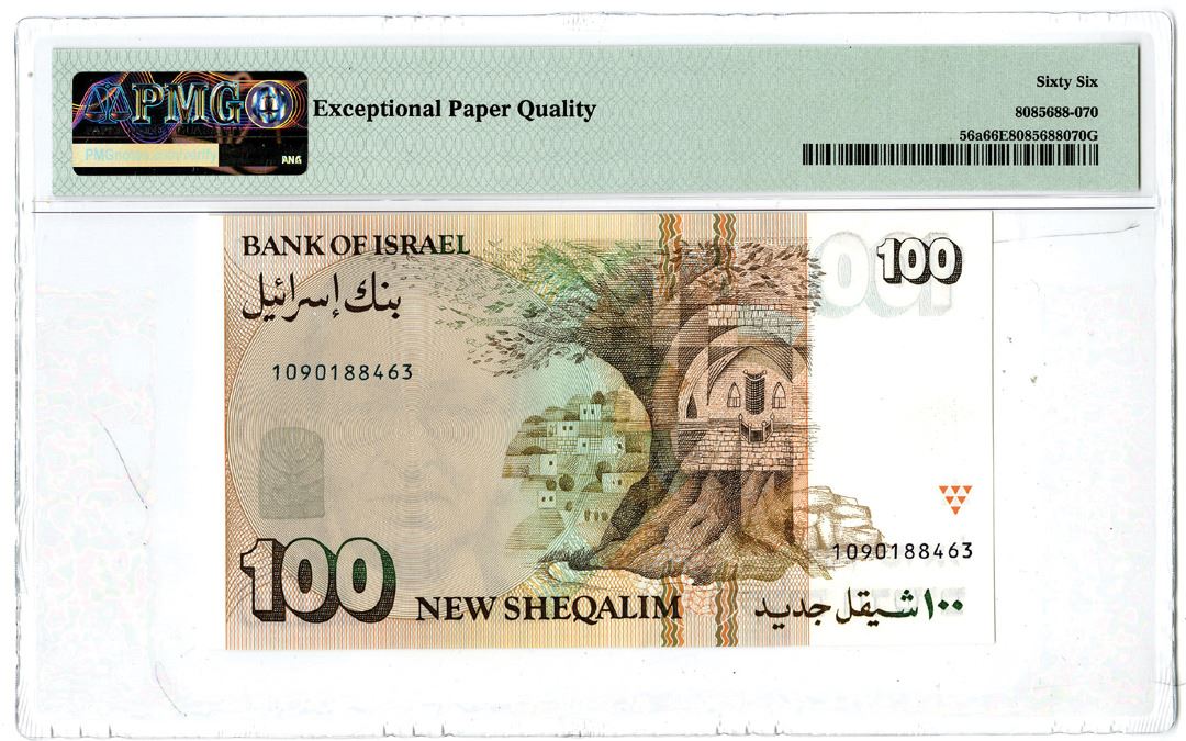 Israel. 1986/5746. 100 New Sheqalim, P-56a, Issued banknote, Brown on face, S/N 1090188463 - Sign. #11, Plain Security Thread, PMG graded Gem Uncirculated 66 EPQ. Printer: JEZ.