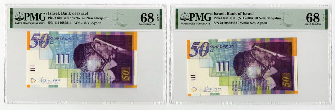 Israel, Lot of 2 Issued banknotes, both PMG graded Superb Gem Unc 68 EPQ, Includes: 2001 (ND 2003), 50 New Sheqalim, P-60b, only 2 notes grade higher out of 119 graded in the PMG census; and, 2007, 50 New Sheqalim, P-60c Issued Banknotes. Purple with m/c underprint. (2).