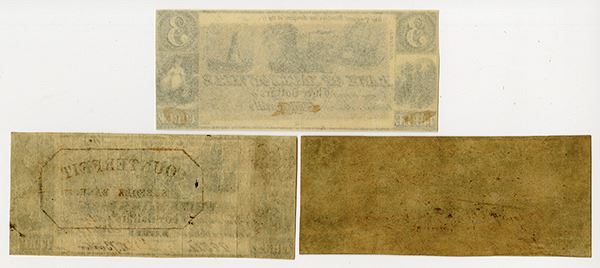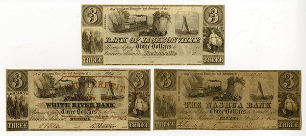 Jacksonville, Nashua, NH; Bethel, CT. Lot of 3 notes, all with $3 denominations and the same design. The Bank of Jacksonville, $3, Haxby FL-25-G6 opened in 1837, failed in 1839, was revived by northern speculators in 1841, and failed again that same year. The FL note is a genuine UI note. Uncirculated; The Nashua Bank operated from 1835 into the 1860s. Both the NH and VT notes are spurious, VG to Fine. The VT note has a red counterfeit stamp on front. NEBNC. (3)