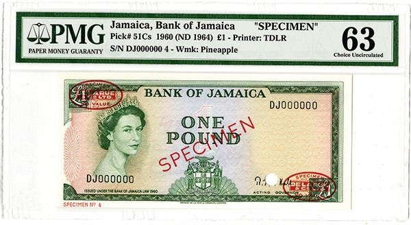 Jamaica. 1 Pound, 1960 (ND 1964), P-51Cs. Specimen banknote, Green on m/c underprint. Queen Elizabeth II at left with arms and motto at bottom center, while the back shows men on large tractor. PMG graded Choice UNC 63, with notation on back "Previously Mounted." S/N DJ000000 4. (Cert # 5003604-013). TDLR.