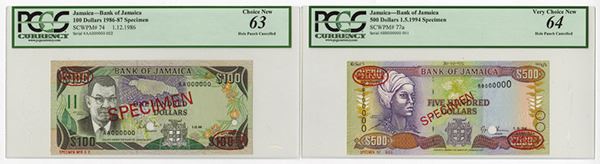 Jamaica. Lot of 2 specimen notes, includes specimen $100, dated 1.12.1986, P-74s, Specimen No. 002, PCGS Currency Choice New 63 with "mounting residue on back"; and specimen $500, dated, 1.5.1994 (1995), P-77as, Specimen No. 001, PCGS Currency Very Choice New 64 with "mounting remnants on back". Both notes Hole Punch Cancelled. TDLR.